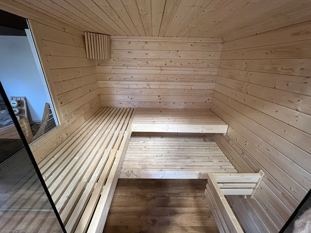 3 Liegen, 2 Kopfstützen, Ofenschutz, Saunaleuchte, 9kW Bio-Kombiofen, externe Steuerung, Steine