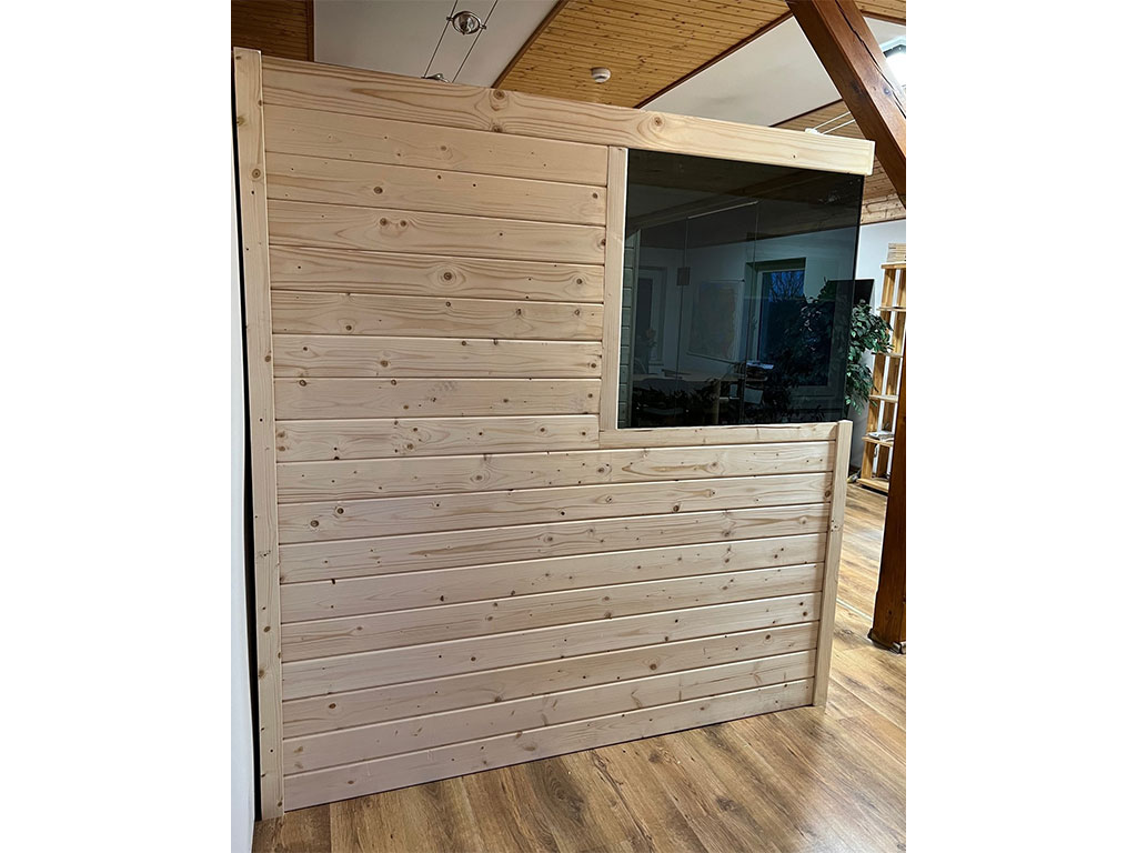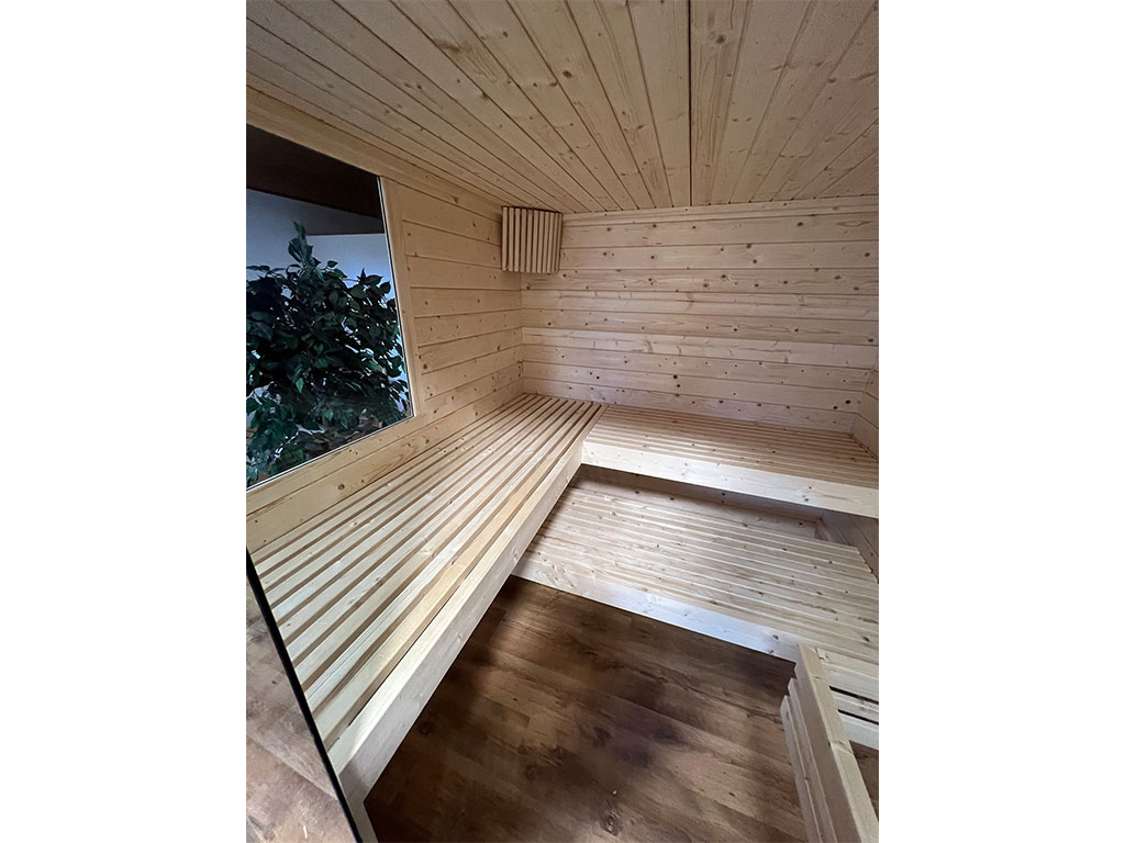 Lieferumfang: | 3 Liegen, 2 Kopfstützen, Ofenschutz, Saunaleuchte, 9kW Bio-Kombiofen, externe Steuerung, Steine |