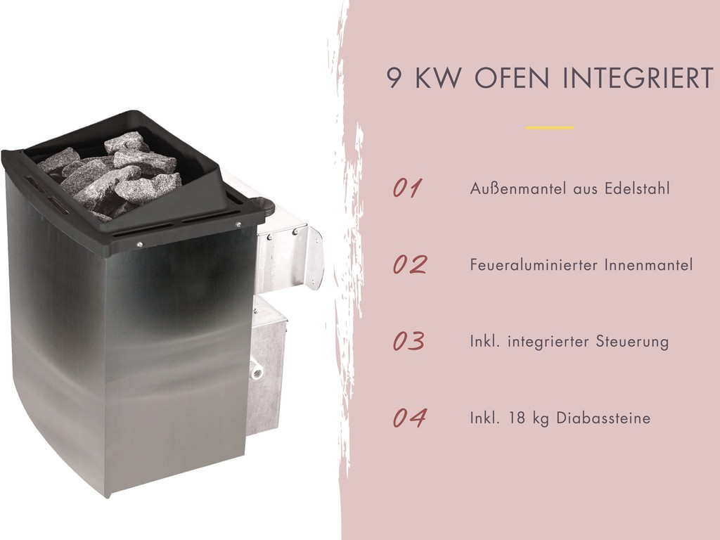 3 Liegen, Ofenschutzgitter aus stabilem Fichtenholz, 1 Kopfstütze aus Espenholz, 9 kW Ofen mit externer Steuerung, Bodenrost, Montageanleitung.