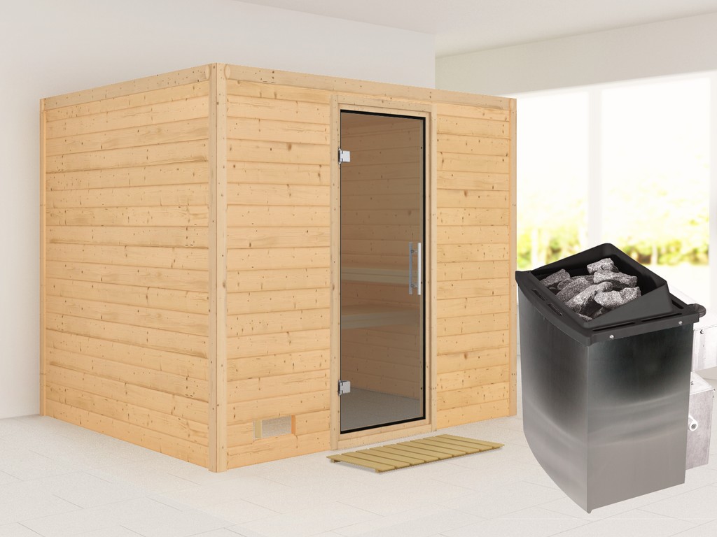 B x T x H: 231 x 196 x 200 cm, 3 Liegen, inkl. 9 kW Saunaofen + int. Steuerung