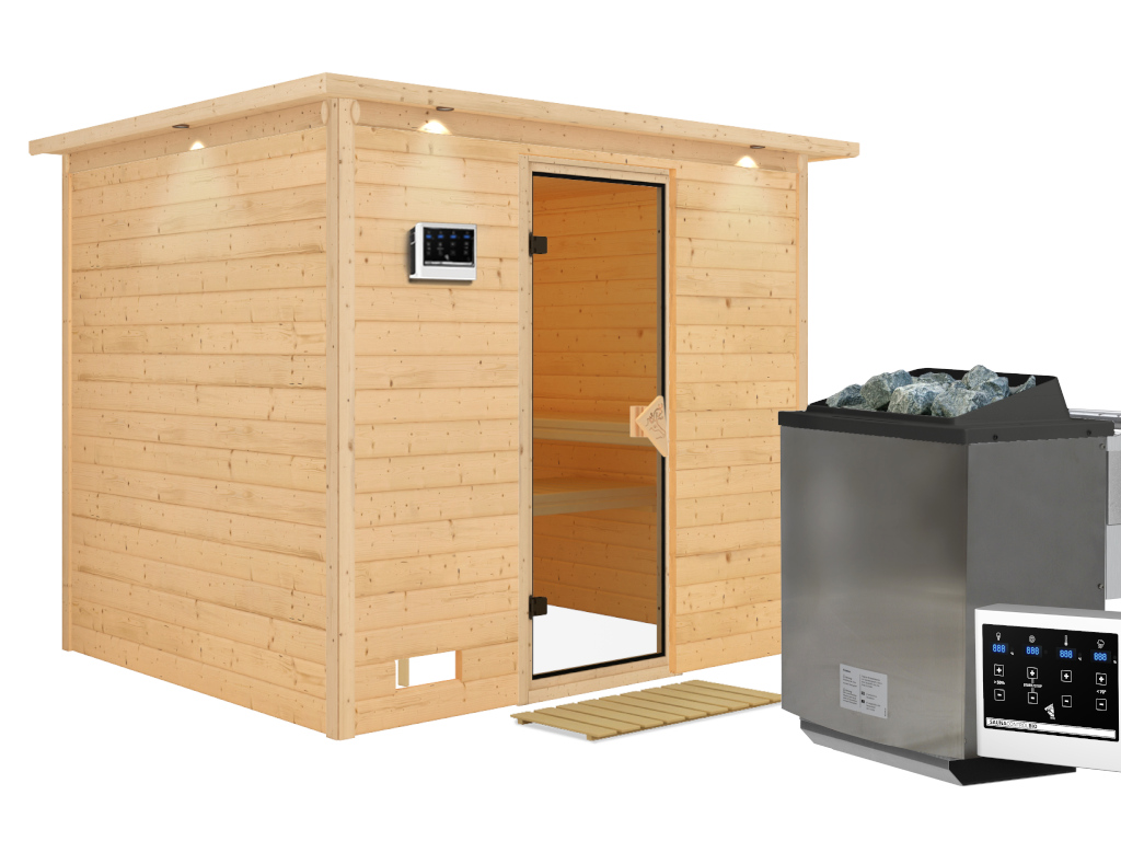 Bei dieser Innensauna ist ein Saunaofen mit einer externen Steuerung inklusive. Das Steuergerät wird außerhalb der Sauna angebracht. Auf diese Weise fängt schon vor dem Saunieren der Komfort an – mit einer bequemen Bedienung von außen und einer noch exakteren Temperatureinstellung. Weitere elektrische Geräte, wie die Kabinenbeleuchtung, können ebenso an die externe Steuerung angeschlossen und bedient werden.