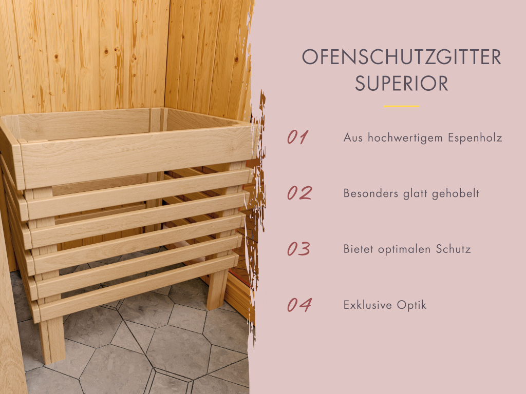 3 Liegen, Ofenschutzgitter aus stabilem Fichtenholz, 1 Kopfstütze aus Espenholz, 9 kW Bio-Kombiofen mit externer Steuerung, Dachkranz inkl. 3 LED-Strahlern á 7, 5 Watt, Bodenrost, Ofenschutzgitter, Montageanleitung.