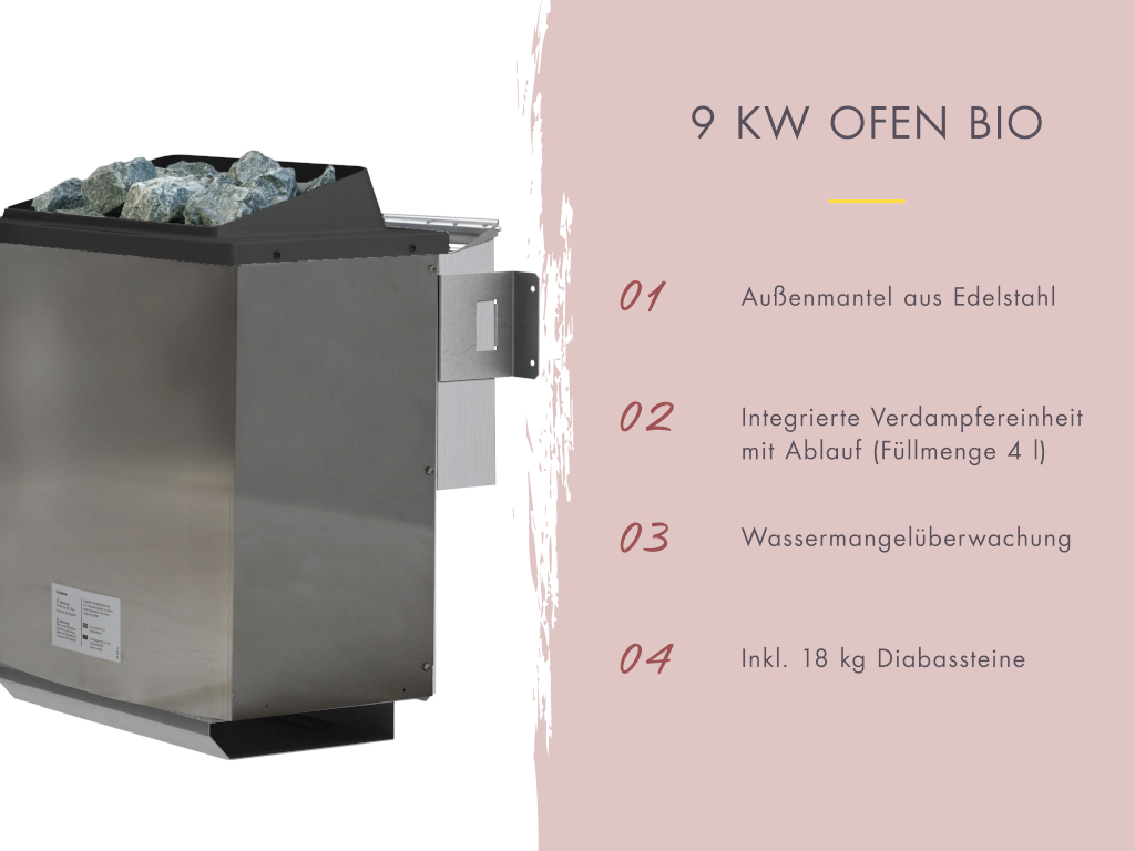 Das Herzstück einer Sauna ist ihr Ofen: Er haucht ihr Leben ein, bestimmt wie warm es wird und welche Art von Saunagang genossen werden kann. Für eine klassische, finnische Sauna ist dieser 9 kW (3 x 16 A) starke Bio-Saunaofen optimal. Er erreicht eine Temperatur von bis zu 110 °C und besitzt einen feueraluminierten Innenmantel. Mit dem Zusatz als Bio-Kombiofen hat er obendrein noch eine spezielle Dampf-Einheit und ermöglicht damit gleich vier facettenreiche Saunagang-Variationen: die besonders heiße und trockene finnische Sauna, die stärkende Kräuterdampf-Kur, das feuchtwarme Soft-Dampfbad und das schonende Familienbad.