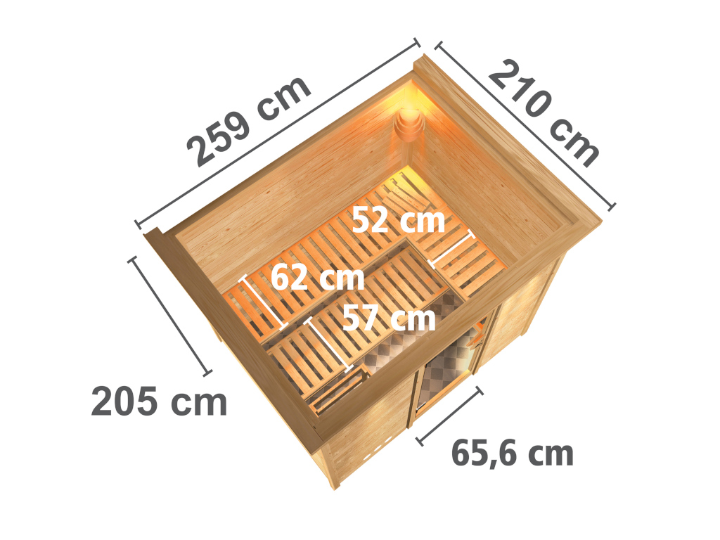 • Innenmaße: Die Innenmaße dieser Sauna mit B 219 × T 185 × H 192 cm erlauben es, dass 2-3 Personen gleichzeitig saunieren können.