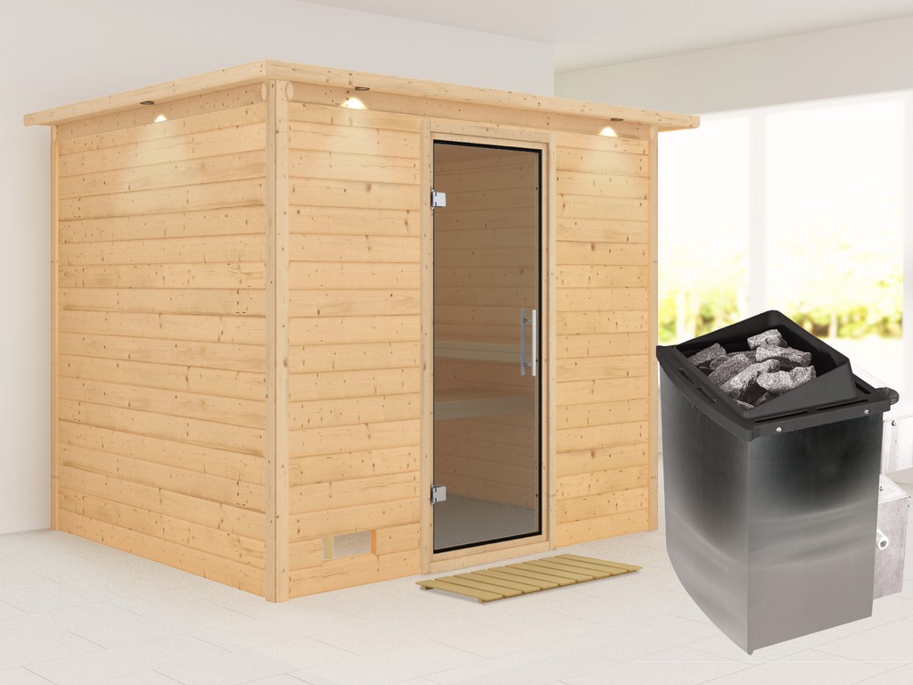 B x T x H: 259 x 210 x 205 cm, 3 Liegen, inkl. 9 kW Saunaofen + int. Steuerung