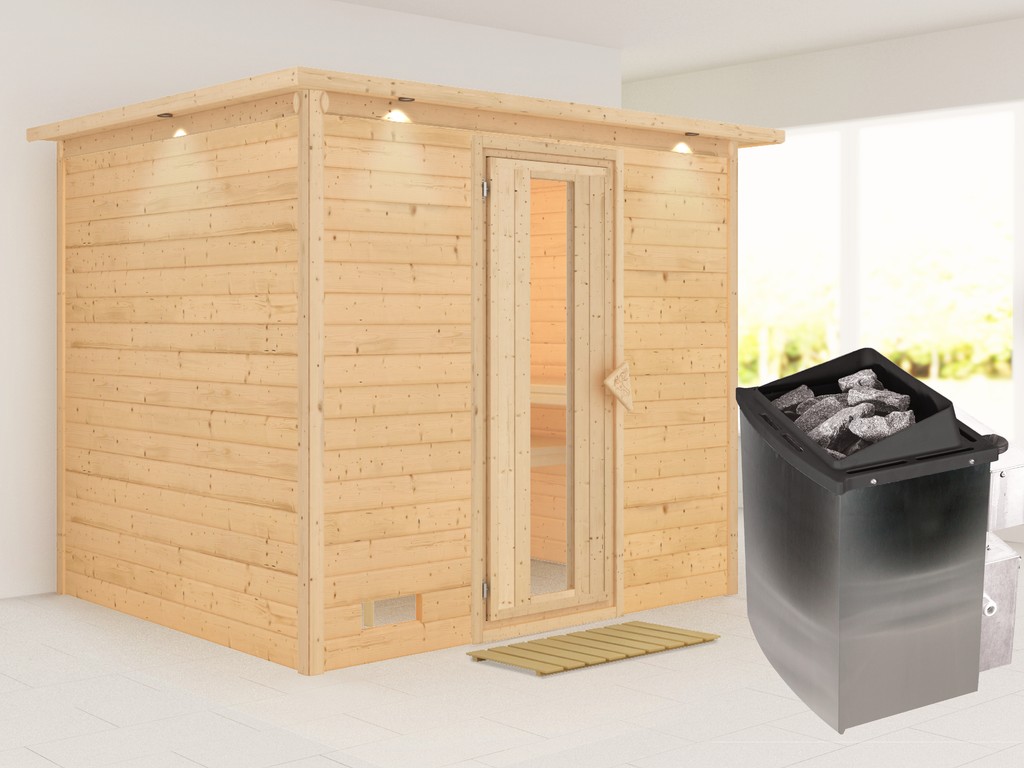 B x T x H: 259 x 210 x 205 cm, 3 Liegen, inkl. 9 kW Saunaofen + int. Steuerung