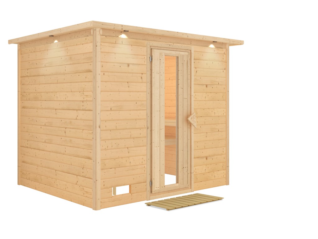 | Lieferumfang: | 3 Liegen, 1 Kopfstütze aus Espenholz, Ofenschutzgitter aus stabilem Fichtenholz, Dachkranz inkl. 3 LED-Strahlern á 7, 5 Watt, Bodenrost, Montageanleitung. |