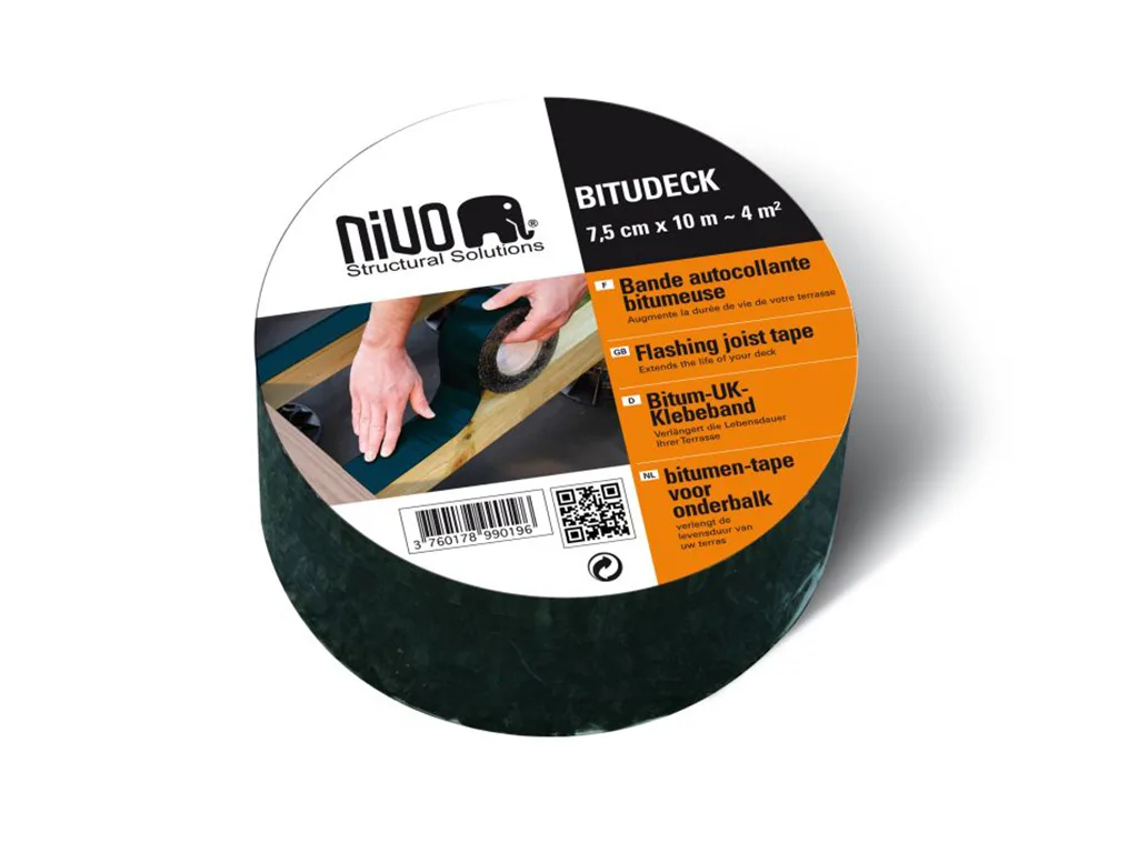 Das BITUDECK-Band von Fiberdeck ist ein Wasserdichtungsband, bestehend aus einer dicken Bitumenschicht, die mit einer matten und undurchsichtigen schwarzen HDPE-Folie überzogen ist.