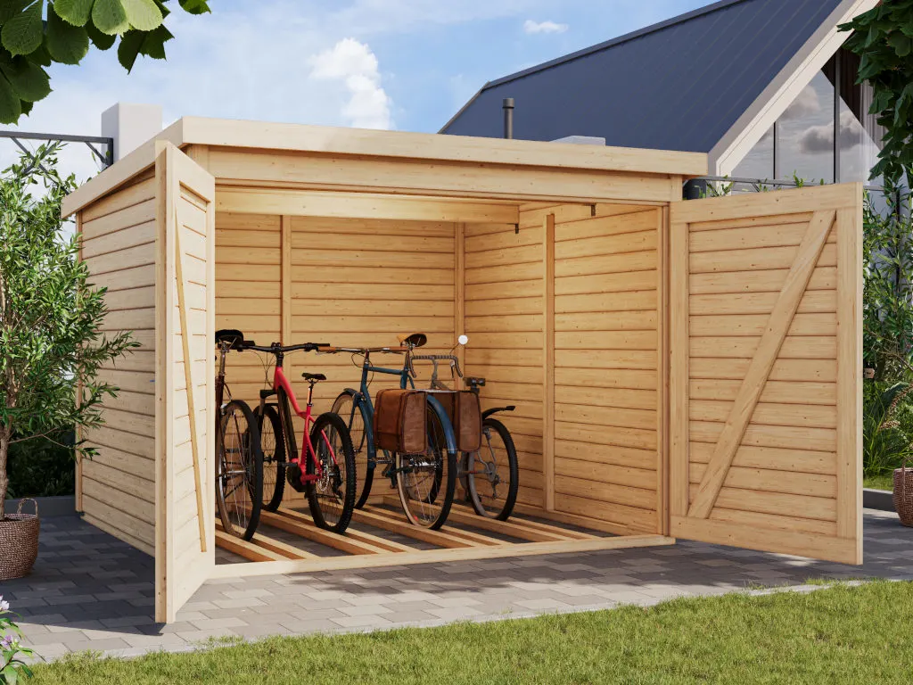 Um die Langlebigkeit des Holzes zu erhöhen und die Bikebox optisch aufzuwerten, wurde die Oberfläche mit Lack behandelt. Der Holzlack bietet Schutz, indem er die Außenwände versiegelt. Somit ist sie von Anfang an gegen Witterungseinflüsse und Schädlinge geschützt.
