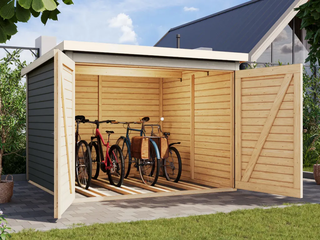 Um die Langlebigkeit des Holzes zu erhöhen und die Bikebox optisch aufzuwerten, wurde die Oberfläche mit Lack behandelt. Der Holzlack bietet Schutz, indem er die Außenwände versiegelt. Somit ist sie von Anfang an gegen Witterungseinflüsse und Schädlinge geschützt.