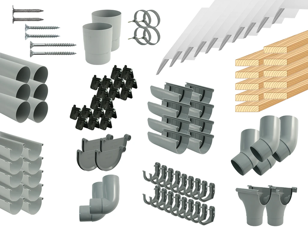 Das Dachrinnenset ist ausgelegt auf Gartenhäuser mit einem Satteldach und erhältlich in verschiedenen Längen (06–12 Meter).