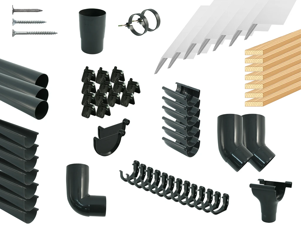 Das Dachrinnenset ist ausgelegt auf Gartenhäuser mit einem Flach- oder Pultdach und erhältlich in verschiedenen Längen (2–10 Meter).