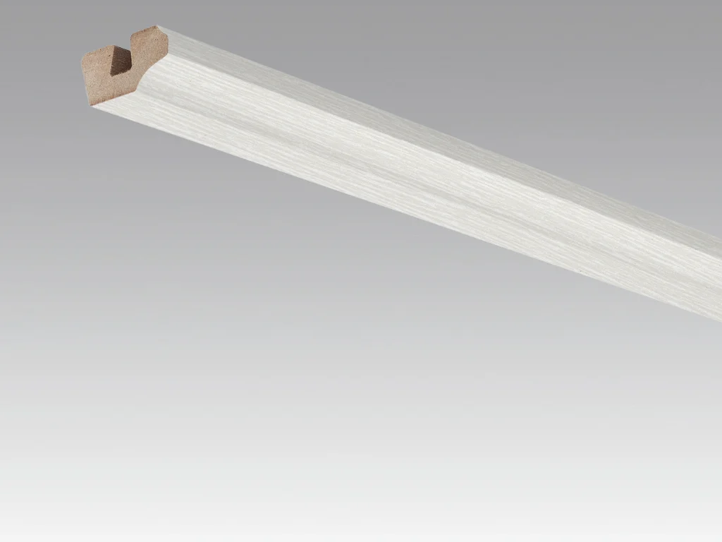 Die weiße Folierung verleiht der Leiste eine dezente Wirkung und passt sich unaufdringlich in unterschiedliche Raumkonzepte ein. Sie verdeckt kleinere Übergänge sauber und sorgt für ein harmonisches Gesamtbild.