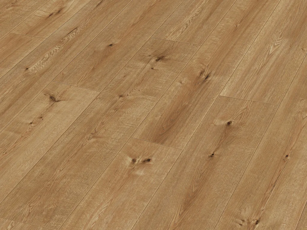 Die Stärke des Bodens ist mit 9 mm angegeben. Dank der Klickverbindung Masterclic Plus lässt sich der Boden ganz einfach schwimmend verlegen.