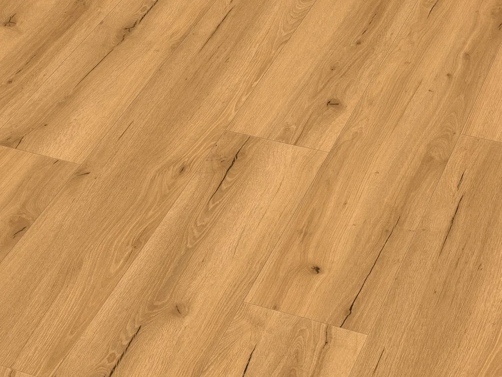 Das Dekor mit typischer Eichenholzmaserung charakterisiert perfekt den Stil der rustikalen Moderne. Landhausdielen besitzen mit ihrer Ein-Stab-Optik einen natürlichen und rustikalen Look, der jeden Raum gemütlich wirken lässt. Die an vier Seiten umlaufende Fase hebt den Dielencharakter besonders hervor. Dank der strukturierten Oberfläche entsteht optisch und fühlbar der Eindruck eines echten Holzbodens.