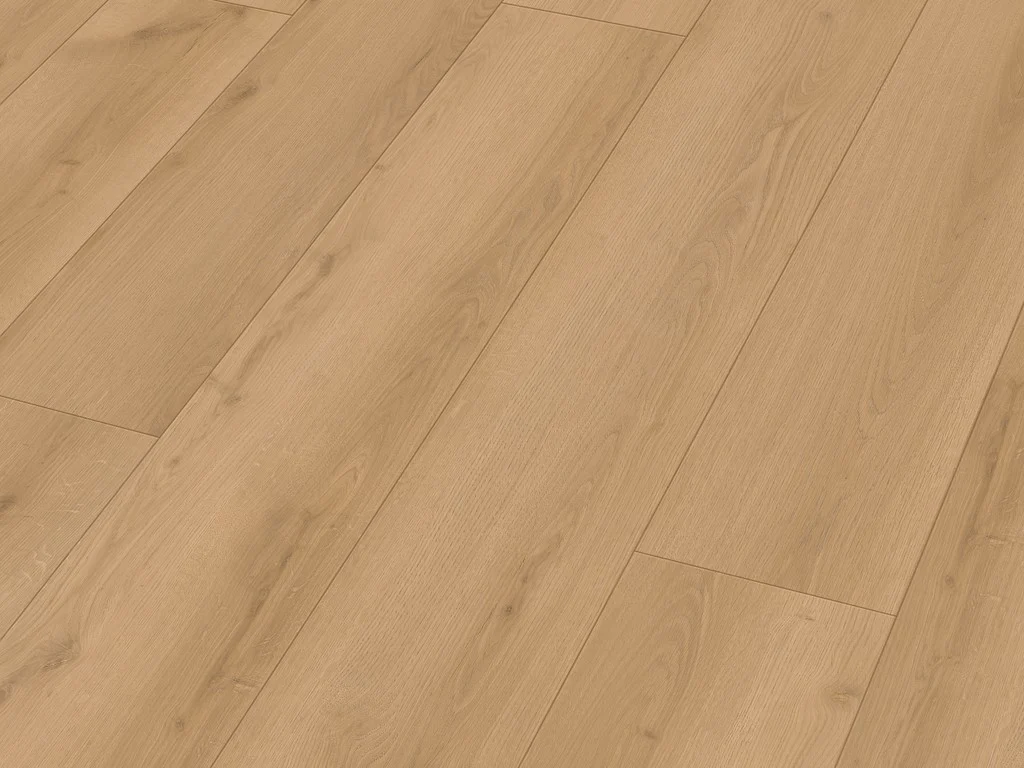 Die markante Eichenholzmaserung des Dekors vermittelt Behaglichkeit und natürliche Lebendigkeit. Landhausdielen besitzen mit ihrer Ein-Stab-Optik einen natürlichen und rustikalen Look, der jeden Raum gemütlich wirken lässt. Die an vier Seiten umlaufende Fase hebt den Dielencharakter besonders hervor. Dank der strukturierten Oberfläche entsteht optisch und fühlbar der Eindruck eines echten Holzbodens.