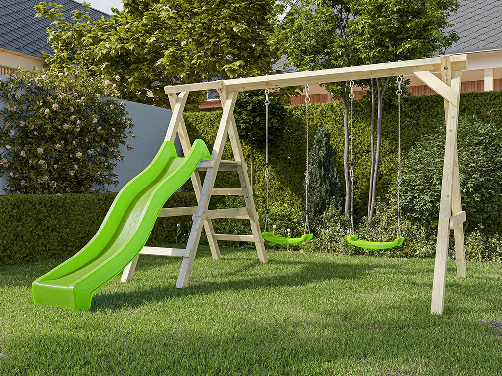 Bei einer Schaukel ist Spaß vorprogrammiert – sie sollte in keiner Kindheit fehlen. Schaukeln ist einfach aufregend und nicht umsonst bei Kindern bis ins Jugendalter und auch bei manchen Erwachsenen noch sehr beliebt. Und da zu zweit spielen noch schöner ist als alleine, hat dieses Modell gleich zwei Schaukelsitze. Die allgemeine Altersempfehlung für Schaukeln liegt bei 3–12 Jahren, für das Gefühl von Leichtigkeit und Freiheit gibt es nach oben hin aber keine Altersbegrenzung. Wer sich nicht entscheiden möchte, ob er lieber schaukeln oder rutschen möchte, trifft mit diesem Modell die richtige Wahl, hier ist beides dabei – für maximalen Spielspaß. Die Podesthöhe liegt bei 120 cm.