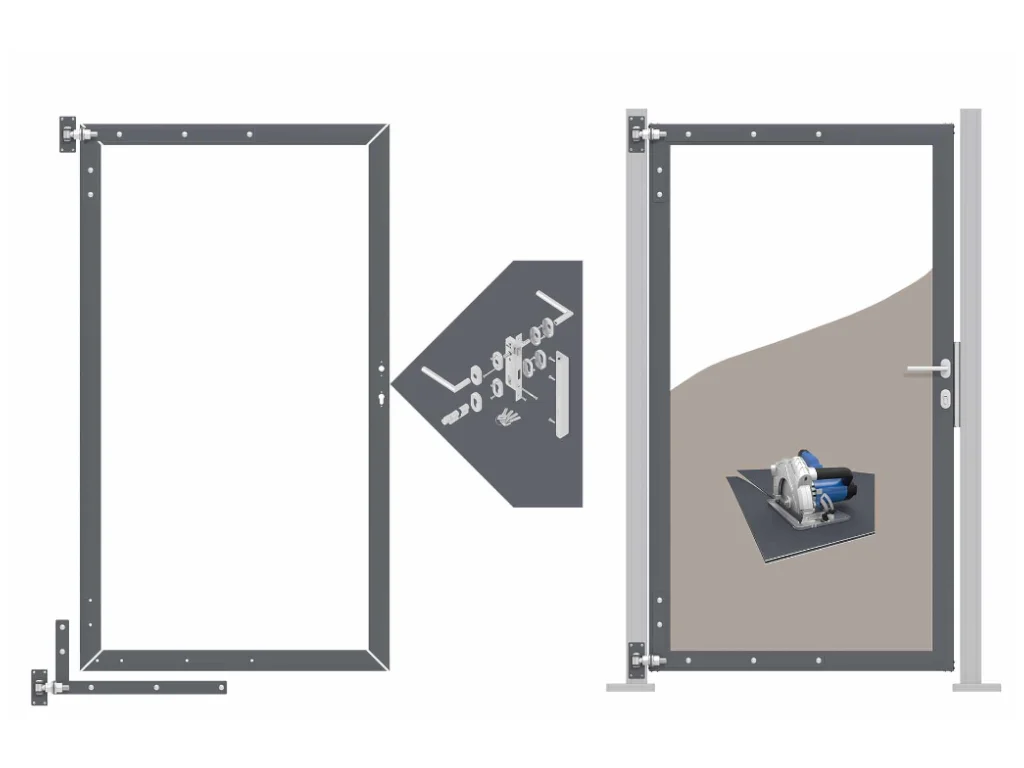 Der anthrazitfarbene Ton des Rahmens fügt sich perfekt in verschiedene Garten- und Hofgestaltungen ein und verleiht deinem Außenbereich eine zeitgemäße Note. Mit dem mitgelieferten Zubehör ist die Montage des Torrahmens unkompliziert: Der 4-teilige Aluminiumrahmen verfügt über eine Nut für 20 mm starke Füllungen, stabile Winkel-Ladenbänder aus verzinktem Stahl, verstellbare Beschläge zur nachträglichen Justierung, einen Edelstahl-Türdrücker sowie ein Einsteckschloss für DIN links und rechts. Dazu kommen ein Profilzylinder mit Drehknauf, Rosetten und 4 Schlüsseln sowie ein Edelstahl-Toranschlag für eine sichere Montage an den Torpfosten.
