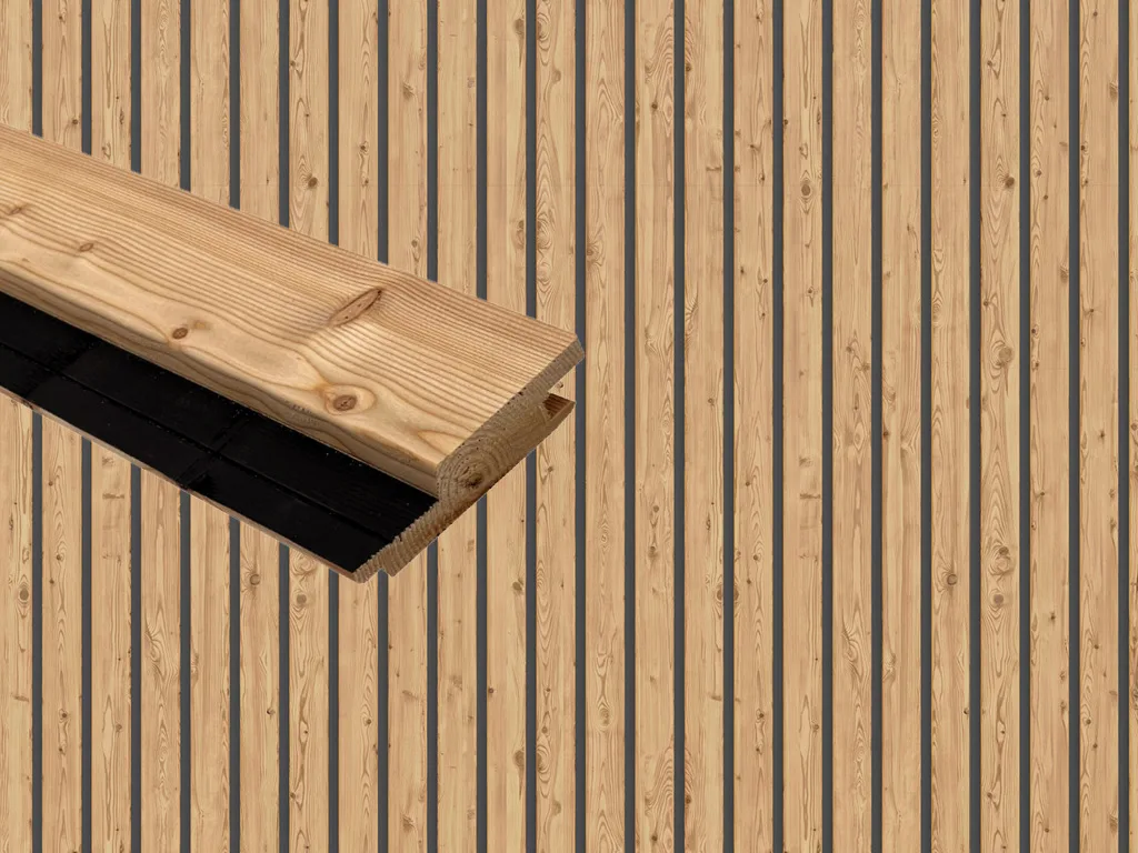 Fassaden aus Holz begeistern nicht nur mit ihrem natürlichen Look. Sie erweisen sich auch als ideale Verkleidung, weil sie selbst nach Jahrzehnten noch einen dauerhaften Witterungsschutz bieten. Die Vorderseite dieser Rhombusleiste besticht dank der Schattenfuge durch einen Hoch-/Tief-Effekt (Schattenfuge) – dies wird durch die schwarze Feder zusätzlich hervorgehoben. Die Rückseite ist glatt und in Holz natur gehalten.