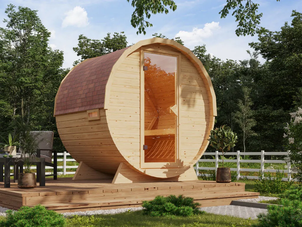 Fasssaunen ziehen mit ihrer außergewöhnlichen Optik nicht nur alle Blicke auf sich, sondern bieten auch hervorragende technische Eigenschaften. Die runde Form ermöglicht eine optimale Luft- und Wärmezirkulation sowie ein besonders schnelles, sparsames Erhitzen ohne unangenehmen Hitzestau in den Ecken und unter der Decke. Dank ihrer kompakten Form und geringen Grundfläche sind Fasssaunen besonders gut für kleine Gärten geeignet. In diesem Modell können 1-2 Personen gleichzeitig saunieren.