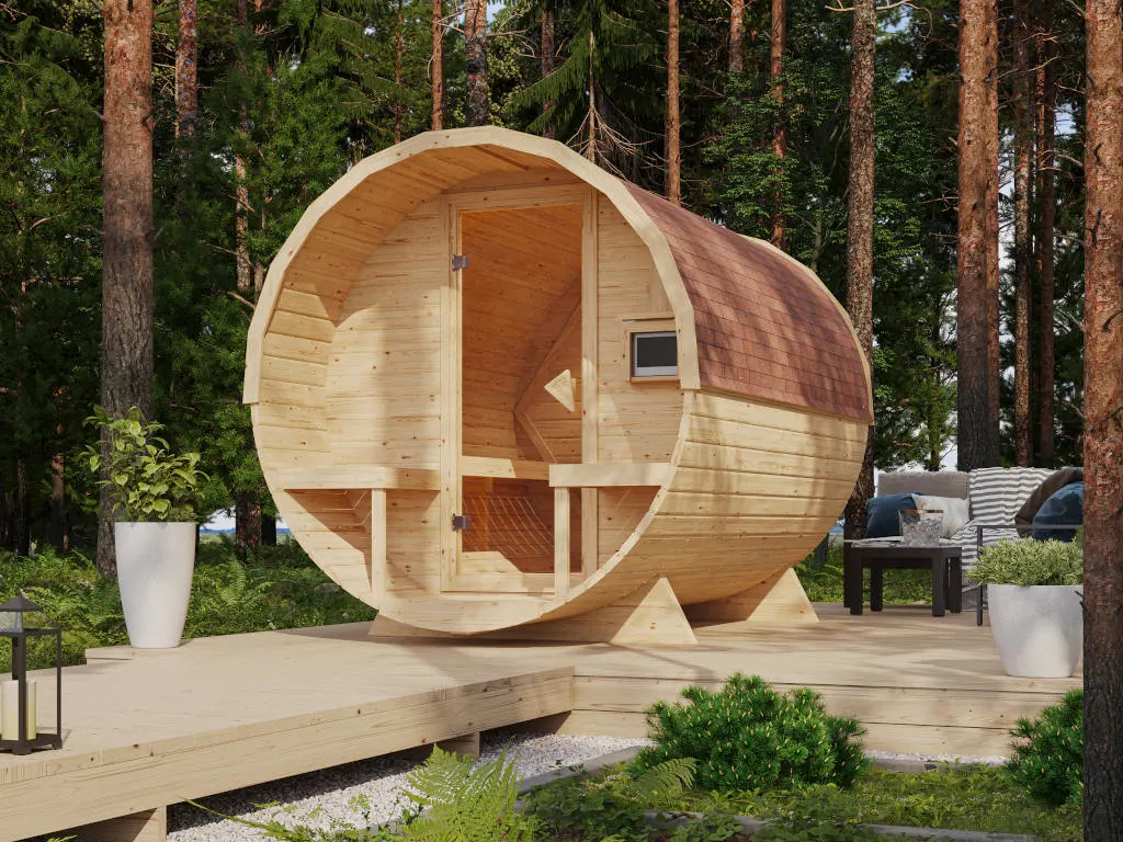 Fasssaunen ziehen mit ihrer außergewöhnlichen Optik nicht nur alle Blicke auf sich, sondern bieten auch hervorragende technische Eigenschaften. Die runde Form ermöglicht eine optimale Luft- und Wärmezirkulation sowie ein besonders schnelles, sparsames Erhitzen ohne unangenehmen Hitzestau in den Ecken und unter der Decke. Dank ihrer kompakten Form und geringen Grundfläche sind Fasssaunen besonders gut für kleine Gärten geeignet. In diesem Modell können 1-2 Personen gleichzeitig saunieren.