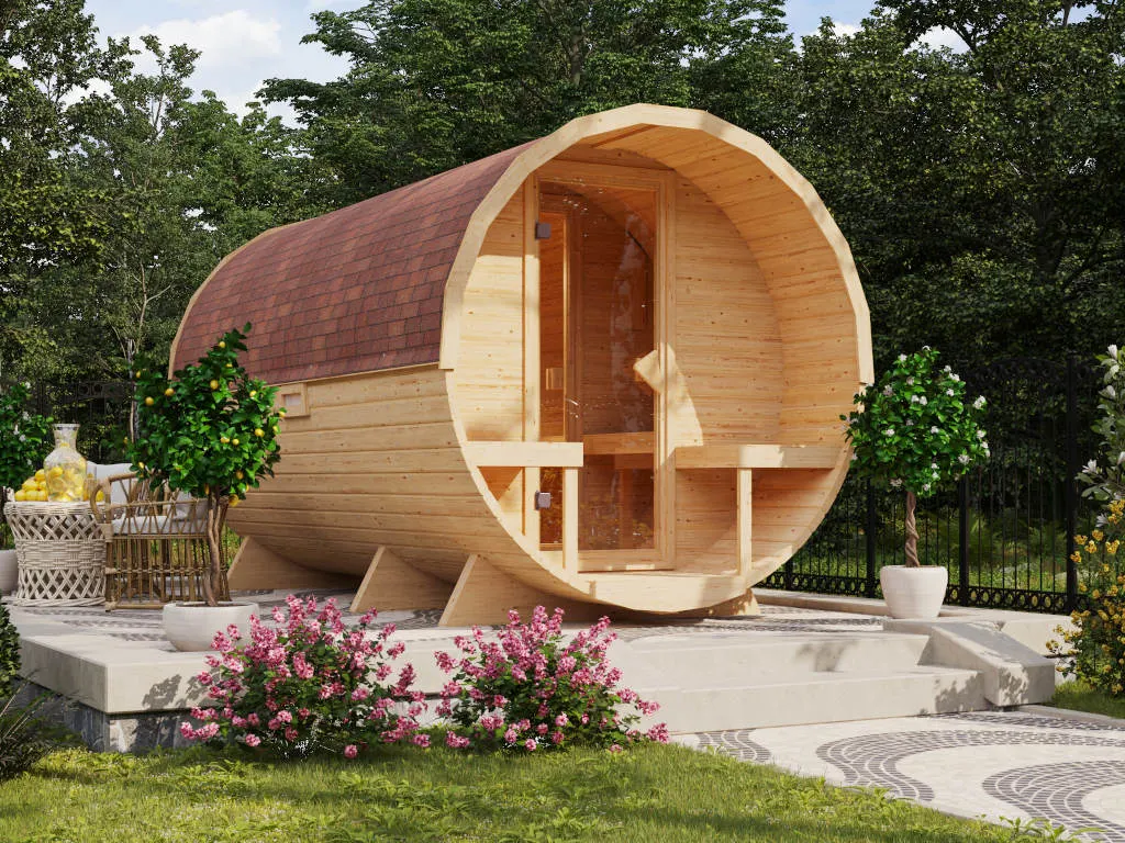Fasssaunen ziehen mit ihrer außergewöhnlichen Optik nicht nur alle Blicke auf sich, sondern bieten auch hervorragende technische Eigenschaften. Die runde Form ermöglicht eine optimale Luft- und Wärmezirkulation sowie ein besonders schnelles, sparsames Erhitzen ohne unangenehmen Hitzestau in den Ecken und unter der Decke. Dank ihrer kompakten Form und geringen Grundfläche sind Fasssaunen besonders gut für kleine Gärten geeignet. In diesem Modell können 4-5 Personen gleichzeitig saunieren.