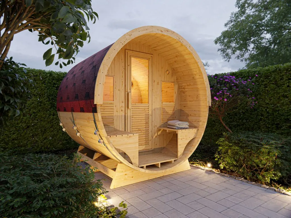 Fasssaunen ziehen mit ihrer außergewöhnlichen Optik nicht nur alle Blicke auf sich, sondern bieten auch hervorragende technische Eigenschaften. Die runde Form ermöglicht eine optimale Luft- und Wärmezirkulation sowie ein besonders schnelles, sparsames Erhitzen ohne unangenehmen Hitzestau in den Ecken und unter der Decke. Dank ihrer kompakten Form und geringen Grundfläche sind Fasssaunen besonders gut für kleine Gärten geeignet. In dieser Sauna können 1-2 Personen gleichzeitig saunieren.