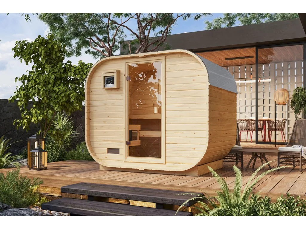 Fasssaunen ziehen mit ihrer außergewöhnlichen Optik nicht nur alle Blicke auf sich, sondern bieten auch hervorragende technische Eigenschaften. Die runde Form ermöglicht eine optimale Luft- und Wärmezirkulation sowie ein besonders schnelles, sparsames Erhitzen ohne unangenehmen Hitzestau in den Ecken und unter der Decke. Dank ihrer kompakten Form und geringen Grundfläche sind Fasssaunen besonders gut für kleine Gärten geeignet. In dieser Sauna können 2-4 Personen gleichzeitig saunieren.
