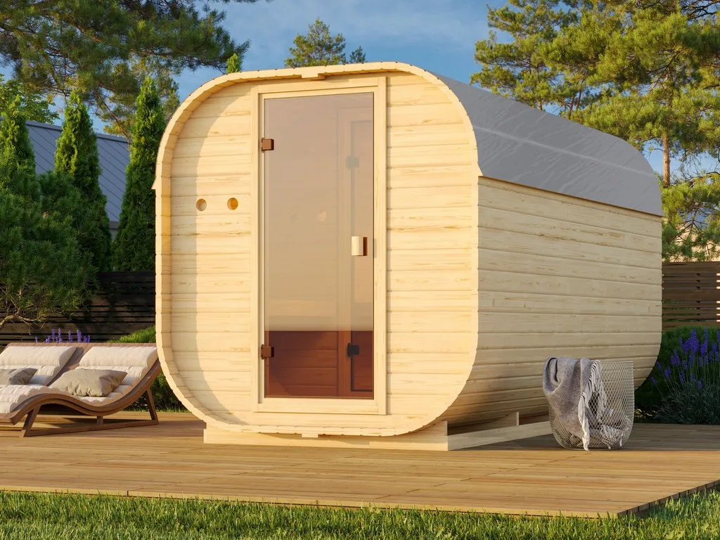 Fasssaunen ziehen mit ihrer außergewöhnlichen Optik nicht nur alle Blicke auf sich, sondern bieten auch hervorragende technische Eigenschaften. Die runde Form ermöglicht eine optimale Luft- und Wärmezirkulation sowie ein besonders schnelles, sparsames Erhitzen ohne unangenehmen Hitzestau in den Ecken und unter der Decke. Dank ihrer kompakten Form und geringen Grundfläche sind Fasssaunen besonders gut für kleine Gärten geeignet. In diesem Modell können 4-5 Personen gleichzeitig saunieren.
