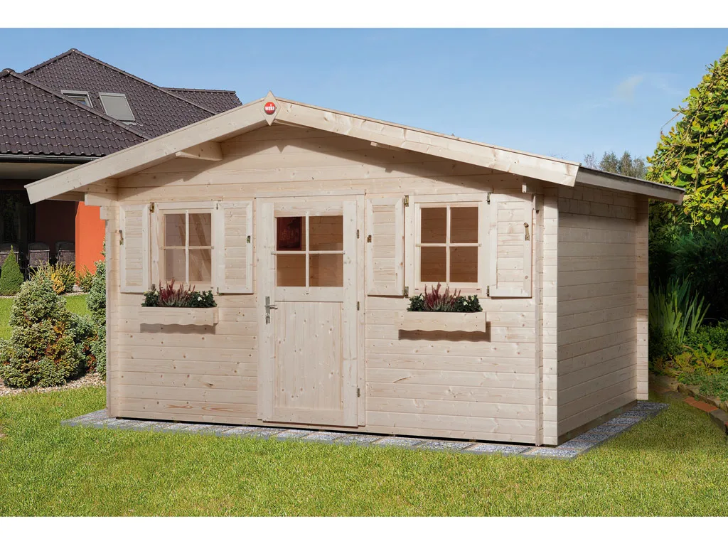 Als der Klassiker unter den Gartenhäusern verfügt ein Blockbohlenhaus über eine sehr robuste Bauweise, gepaart mit einer besonderen, natürlichen Ästhetik. Dabei orientiert sich die Bohlenbauweise an der traditionellen Blockhütte. Die Wände setzen sich aus vorgefertigten Holzbohlen zusammen, die dank einer Nut- und Feder-Verbindung ohne größere Anstrengungen aufeinander gesteckt werden können. Damit ist ein einfacher und schneller Auf- und Abbau garantiert. An der Kopfseite des Gartenhauses sorgt die charakteristische Verkämmung (spezielle Einkerbungen im Holz) nicht nur für eine schöne Optik, sondern hält das ganze Konstrukt auch zusammen und macht es absolut wind- und wetterfest.