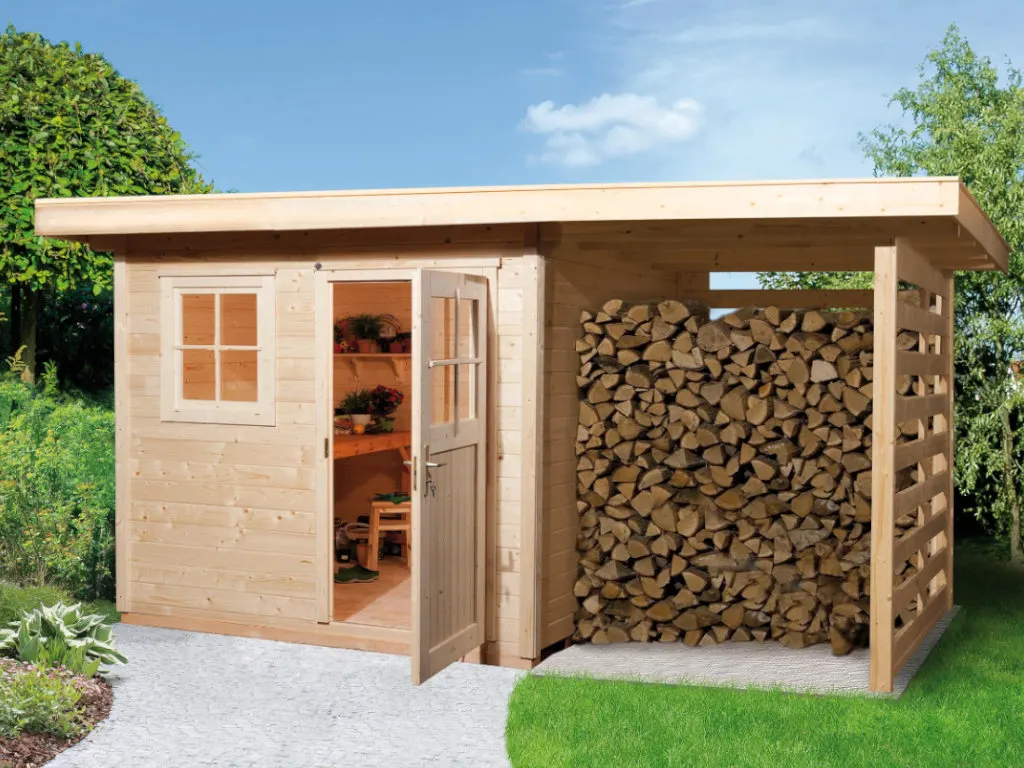Das Gartenhaus mit Anbaudach ermöglicht eine multifunktionale Nutzung. Das Anbaudach schafft zusätzlichen Stauraum für Gartengeräte oder Fahrräder. Durch die Lamellenwände sind Deine Geräte optimal gegen Wind, Regen und die Blicke neugieriger Nachbarn geschützt. Alternativ kann der Platz unterm Anbaudach auch als gemütlicher Ort zum Sitzen und Verweilen genutzt werden. Lamellen sorgen für eine gute Durchlüftung und besonders im Sommer verhindern sie die unangenehme Stauhitze. Viel Platz für Dein Holz! Das Gartenhaus wird inklusive Kaminholzanbau mit Anbaudach geliefert. Mit der seitlichen Überdachung ist Dein Brennholz optimal vor Witterungseinflüssen geschützt und ordentlich gelagert.