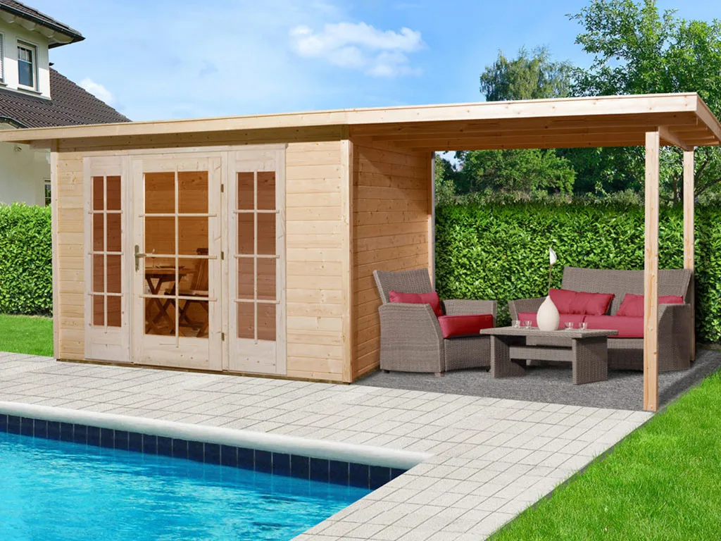 Für mehr Raum und vielfältige Nutzungsmöglichkeiten sorgt dieses Gartenhaus mit Anbaudach. Das großzügig geschnittene Anbaudach ermöglicht es, den Gartenalltag in vollen Zügen im Freien genießen zu können – geschützt vor Sonne, Wind und Regen. Der Platz unter dem Dach kann als gemütliche Terrasse zum Sitzen, Spielen oder Werkeln bei jedem Wetter genutzt werden. Alternativ eignet es sich auch als optimaler Unterstellplatz für zahlreiche Gartengeräte.