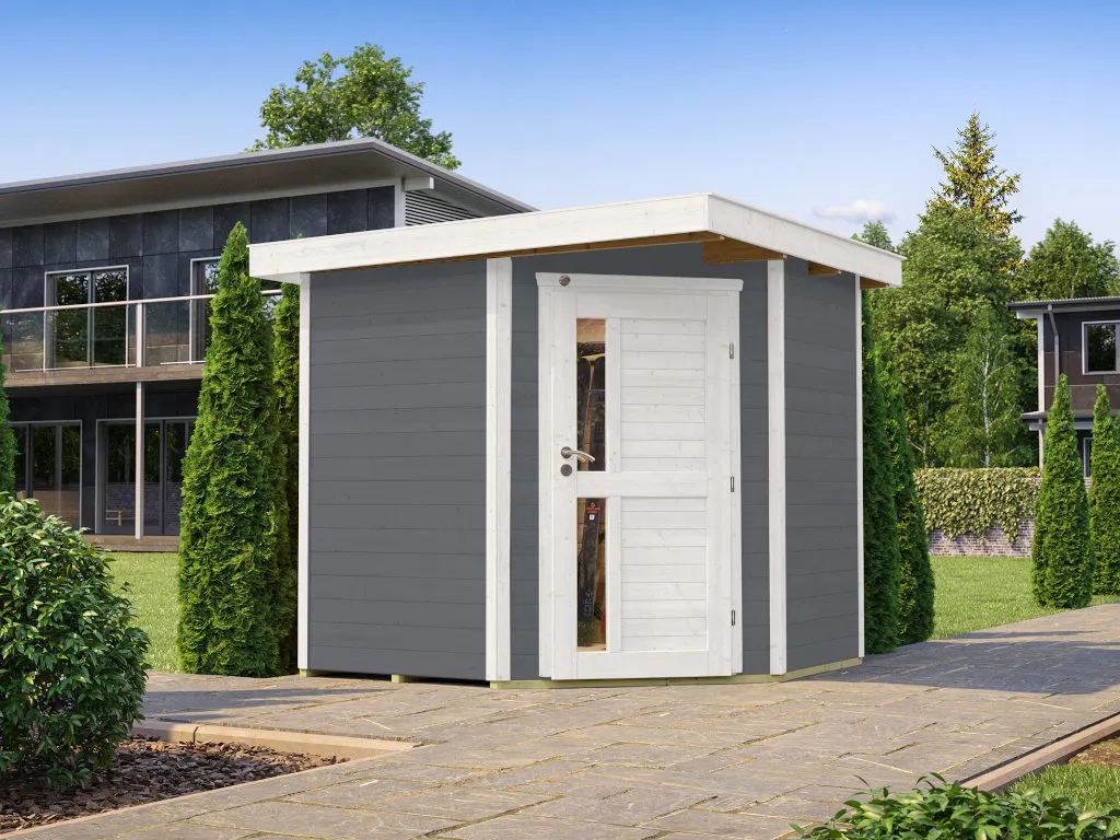 Die Grundfläche des Gartenhauses beträgt 4,28 m² mit einem Sockelmaß von B x T: 209 x 205 cm (B x T). Eine optimale Raumnutzung wird dank einer Firsthöhe von 217 cm gewährt.