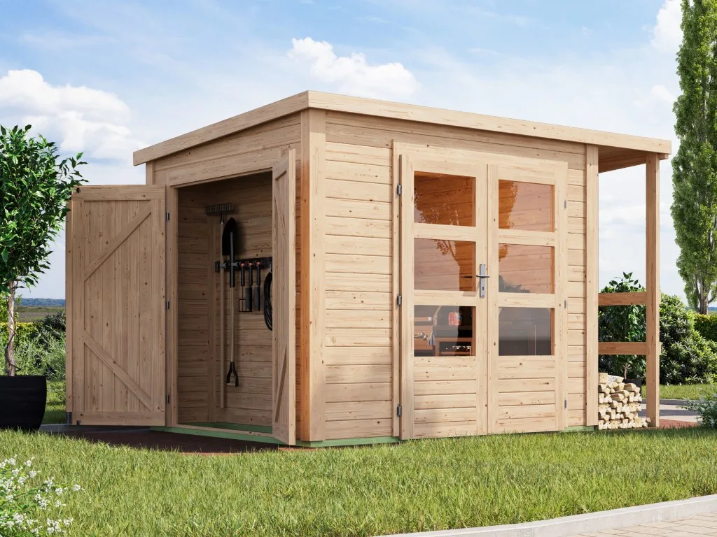 Für besonders viel Stauraum sorgt das Gartenhaus dank Anbauschrank, der mitgeliefert wird. Das Anbaudach und der zusätzliche Anbauschrank eignen sich optimal als Lagerplatz für Gartenmöbel und Gartenutensilien. Durch die Überdachung sind diese stets vor Regen und Sonne geschützt.