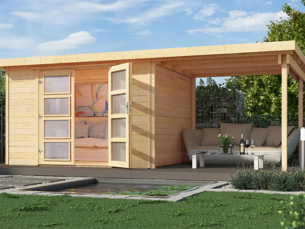 Für mehr Raum und vielfältige Nutzungsmöglichkeiten sorgt dieses Gartenhaus mit Anbaudach. Das großzügig geschnittene Anbaudach ermöglicht es, den Gartenalltag in vollen Zügen im Freien genießen zu können – geschützt vor Sonne, Wind und Regen. Der Platz unter dem Dach kann als gemütliche Terrasse zum Sitzen, Spielen oder Werkeln bei jedem Wetter genutzt werden. Alternativ eignet es sich auch als optimaler Unterstellplatz für zahlreiche Gartengeräte.