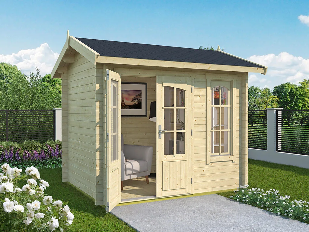 Die Wandstärke von 44 mm sorgt für gute Stabilität und Langlebigkeit. Dank der Bohlenstärke ist das Gartenhaus im Winter frostsicher, und im Sommer hat es gute wärmeisolierende Eigenschaften, was es zu einem perfekten Übernachtungsort für Gäste macht. Auch Pflanzen können in diesem Gartenhaus problemlos überwintern.