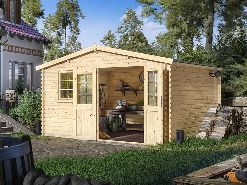 Als der Klassiker unter den Gartenhäusern verfügt ein Blockbohlenhaus über eine sehr robuste Bauweise, gepaart mit einer besonderen, natürlichen Ästhetik. Dabei orientiert sich die Bohlenbauweise an der traditionellen Blockhütte. Die Wände setzen sich aus vorgefertigten Holzbohlen zusammen, die dank einer Nut- und Feder-Verbindung ohne größere Anstrengungen aufeinander gesteckt werden können. Damit ist ein einfacher und schneller Auf- und Abbau garantiert. An der Kopfseite des Gartenhauses sorgt die charakteristische Verkämmung (spezielle Einkerbungen im Holz) nicht nur für eine schöne Optik, sondern hält das ganze Konstrukt auch zusammen und macht es absolut wind- und wetterfest.