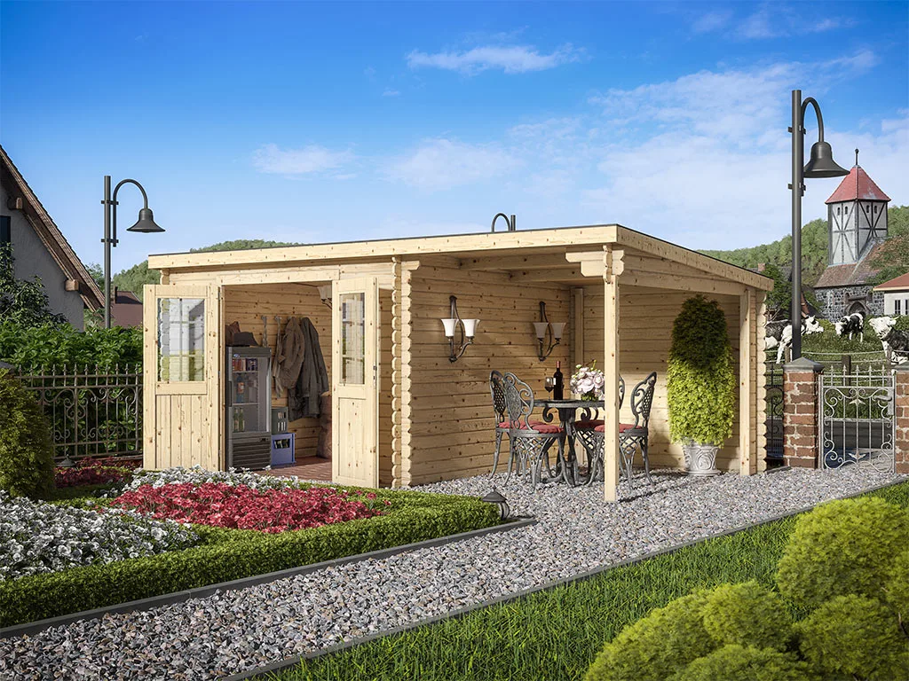 Als der Klassiker unter den Gartenhäusern verfügt ein Blockbohlenhaus über eine sehr robuste Bauweise, gepaart mit einer besonderen, natürlichen Ästhetik. Dabei orientiert sich die Bohlenbauweise an der traditionellen Blockhütte. Die Wände setzen sich aus vorgefertigten Holzbohlen zusammen, die dank einer Nut- und Feder-Verbindung ohne größere Anstrengungen aufeinander gesteckt werden können. Damit ist ein einfacher und schneller Auf- und Abbau garantiert. An der Kopfseite des Gartenhauses sorgt die charakteristische Verkämmung (spezielle Einkerbungen im Holz) nicht nur für eine schöne Optik, sondern hält das ganze Konstrukt auch zusammen und macht es absolut wind- und wetterfest.