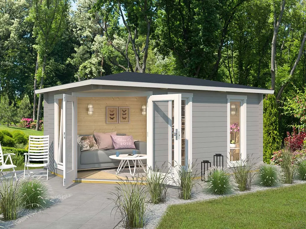 Als der Klassiker unter den Gartenhäusern verfügt ein Blockbohlenhaus über eine sehr robuste Bauweise, gepaart mit einer besonderen, natürlichen Ästhetik. Dabei orientiert sich die Bohlenbauweise an der traditionellen Blockhütte. Die Wände setzen sich aus vorgefertigten Holzbohlen zusammen, die dank einer Nut- und Feder-Verbindung ohne größere Anstrengungen aufeinander gesteckt werden können. Damit ist ein einfacher und schneller Auf- und Abbau garantiert. An der Kopfseite des Gartenhauses sorgt die charakteristische Verkämmung (spezielle Einkerbungen im Holz) nicht nur für eine schöne Optik, sondern hält das ganze Konstrukt auch zusammen und macht es absolut wind- und wetterfest.