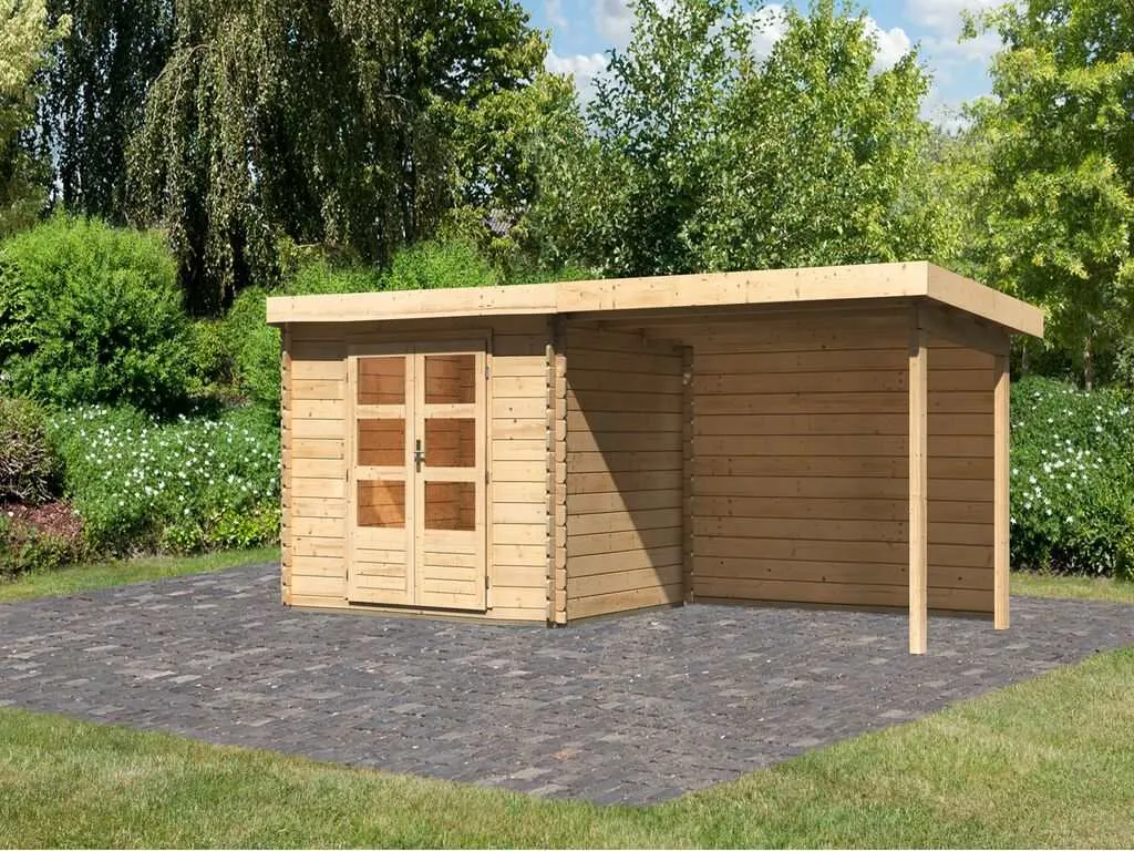 Das Gartenhaus mit Anbaudach und Rückwand ist sehr vielseitig. Der durch das Anbaudach geschaffene zusätzliche Stauraum eignet sich optimal als Lagerplatz für Gartenutensilien oder als Sitzbereich zum gemütlichen Verweilen. Dank Überdachung und integrierter Rückwand sind Geräte und Gartenmöbel optimal vor Wind und Wetter geschützt.