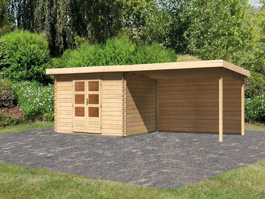 Das Gartenhaus mit Anbaudach und Rückwand ist sehr vielseitig. Der durch das Anbaudach geschaffene zusätzliche Stauraum eignet sich optimal als Lagerplatz für Gartenutensilien oder als Sitzbereich zum gemütlichen Verweilen. Dank Überdachung und integrierter Rückwand sind Geräte und Gartenmöbel optimal vor Wind und Wetter geschützt.