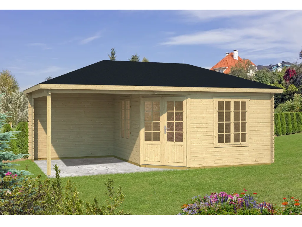 Die Grundfläche des Gartenhauses beträgt 24,9 m². Das Sockelmaß (Haus ohne Anbau) liegt bei 656 x 380 cm (B x T). Eine optimale Raumnutzung wird dank einer Firsthöhe von 304 cm gewährt.