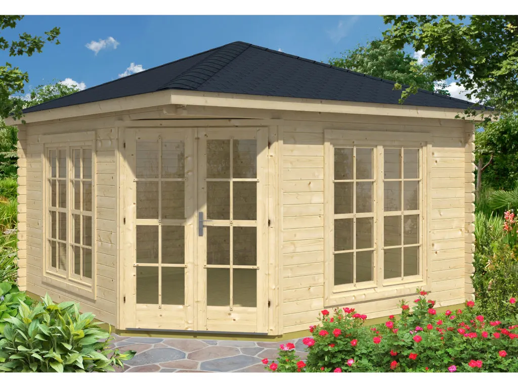 Die Wandstärke von 40 mm sorgt für gute Stabilität und Langlebigkeit. Dank der Bohlenstärke ist das Gartenhaus im Winter frostsicher, und im Sommer hat es gute wärmeisolierende Eigenschaften, was es zu einem perfekten Übernachtungsort für Gäste macht. Auch Pflanzen können in diesem Gartenhaus problemlos überwintern.