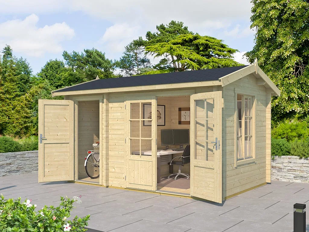 Als der Klassiker unter den Gartenhäusern verfügt ein Blockbohlenhaus über eine sehr robuste Bauweise, gepaart mit einer besonderen, natürlichen Ästhetik. Dabei orientiert sich die Bohlenbauweise an der traditionellen Blockhütte. Die Wände setzen sich aus vorgefertigten Holzbohlen zusammen, die dank einer Nut- und Feder-Verbindung ohne größere Anstrengungen aufeinander gesteckt werden können. Damit ist ein einfacher und schneller Auf- und Abbau garantiert. An der Kopfseite des Gartenhauses sorgt die charakteristische Verkämmung (spezielle Einkerbungen im Holz) nicht nur für eine schöne Optik, sondern hält das ganze Konstrukt auch zusammen und macht es absolut wind- und wetterfest.