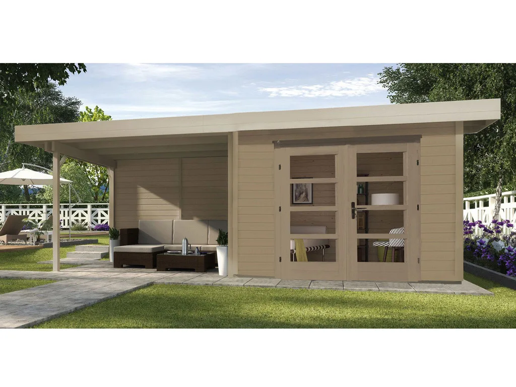 Für mehr Raum und vielfältige Nutzungsmöglichkeiten sorgt dieses Gartenhaus mit Anbaudach. Das großzügig geschnittene Anbaudach ermöglicht es, den Gartenalltag in vollen Zügen im Freien genießen zu können – geschützt vor Sonne, Wind und Regen. Der Platz unter dem Dach kann als gemütliche Terrasse zum Sitzen, Spielen oder Werkeln bei jedem Wetter genutzt werden. Alternativ eignet es sich auch als optimaler Unterstellplatz für zahlreiche Gartengeräte.