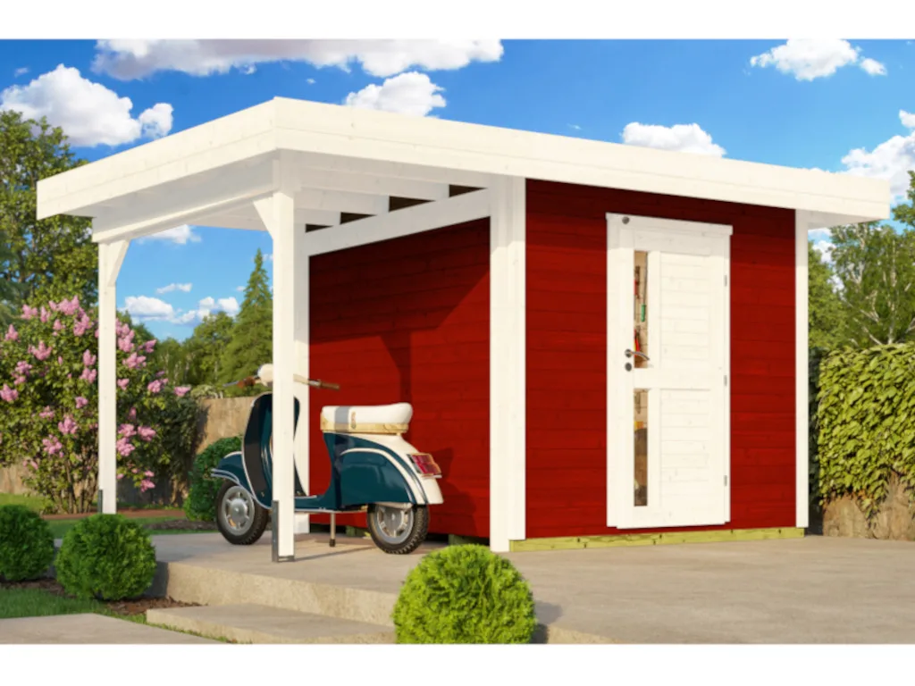 Die Kombination aus Holzlack und Holzlasur bei diesem Gartenhaus sorgt für optimalen Schutz gegen Witterungseinflüsse, Schädlinge und Schimmel und wertet das Haus optisch auf. So wird die Langlebigkeit des Holzes deutlich erhöht und die Freude am Gartenhaus verlängert.