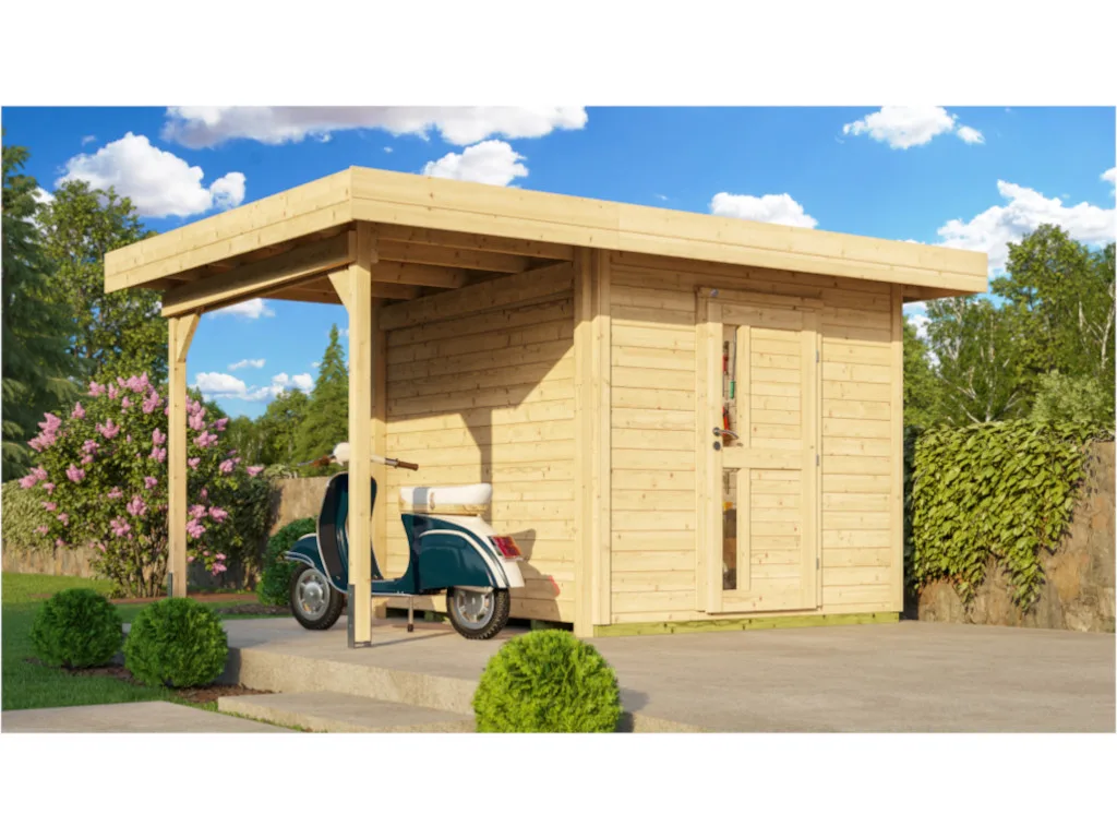 Für mehr Raum und vielfältige Nutzungsmöglichkeiten sorgt dieses Gartenhaus mit Anbaudach. Das großzügig geschnittene Anbaudach ermöglicht es, den Gartenalltag in vollen Zügen im Freien genießen zu können – geschützt vor Sonne, Wind und Regen. Der Platz unter dem Dach kann als gemütliche Terrasse zum Sitzen, Spielen oder Werkeln bei jedem Wetter genutzt werden. Alternativ eignet es sich auch als optimaler Unterstellplatz für zahlreiche Gartengeräte.