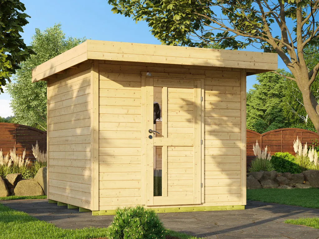 Die Grundfläche des Gartenhauses beträgt 8,25 m² mit einem Sockelmaß von B x T: 235 x 301 cm (B x T). Eine optimale Raumnutzung wird dank einer Firsthöhe von 226 cm gewährt.