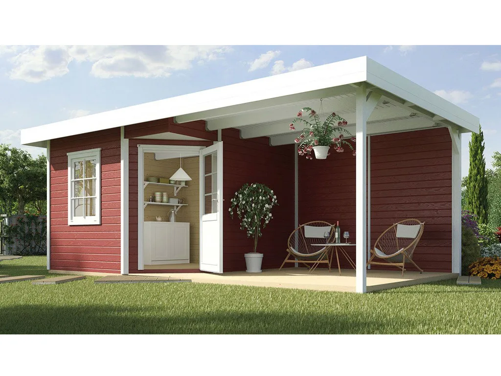 Das Gartenhaus mit Anbaudach und Rückwand ist sehr vielseitig. Der durch das Anbaudach geschaffene zusätzliche Stauraum eignet sich optimal als Lagerplatz für Gartenutensilien oder als Sitzbereich zum gemütlichen Verweilen. Dank Überdachung und integrierter Rückwand sind Geräte und Gartenmöbel optimal vor Wind und Wetter geschützt.