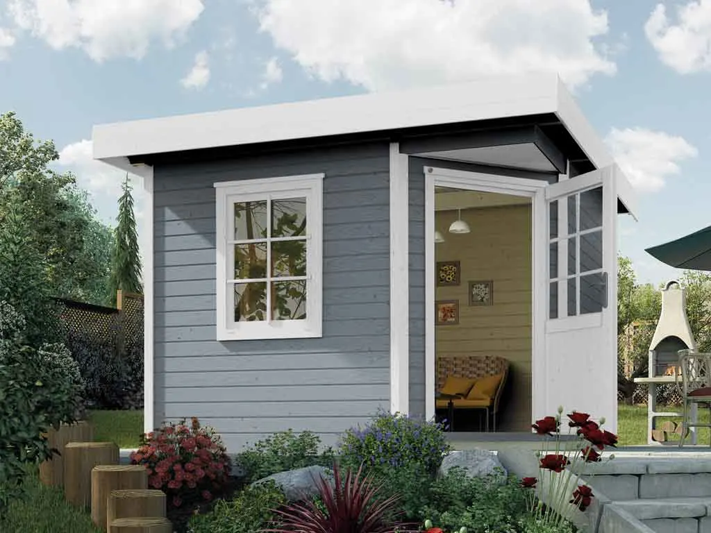 Ein Gartenhaus mit Systembauweise ist eine günstige Alternative zur Blockbohlenbauweise. Auch bei dieser Bauweise werden bereits vorgefertigte Profilhölzer durch eine Nut-und-Feder-Verbindung aufeinander gesteckt. Im Gegensatz zur Blockbohlenbauweise besitzt die Systembauweise jedoch keine Einkerbungen an der Kopfseite des Gartenhauses. Die Bohlen werden stattdessen durch einen innenliegenden Holzrahmen zusammengehalten. Die Ecken werden mit hochkant angebrachten Zierleisten verdeckt. Dies macht den Auf- und Abbau besonders einfach und unkompliziert. Von Vorteil ist auch, dass Fenster und Türen nachträglich eingebaut werden können.